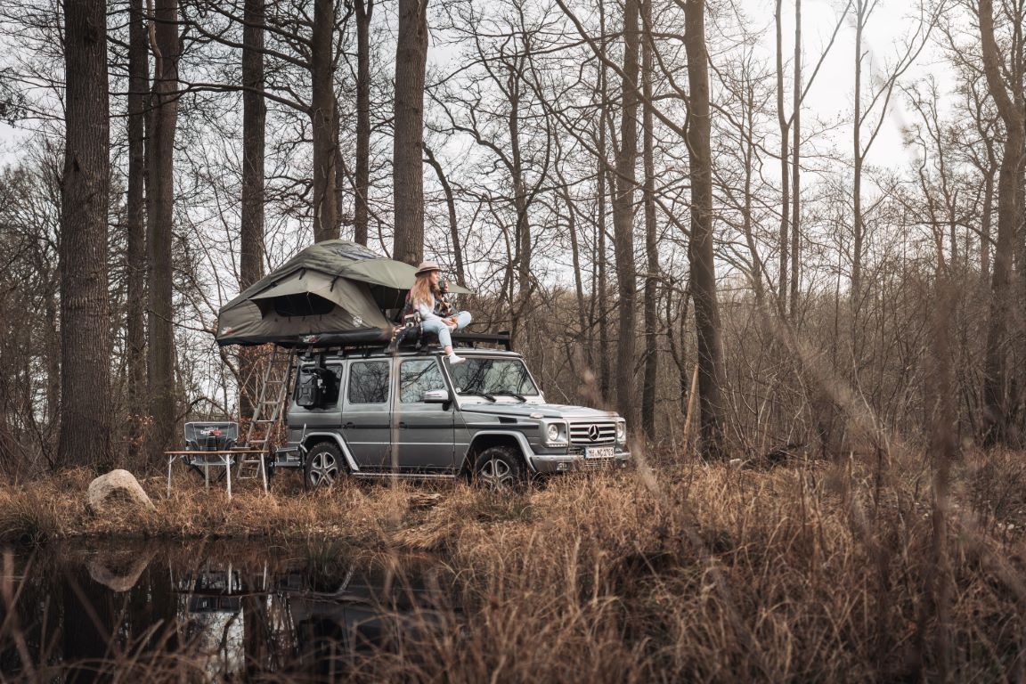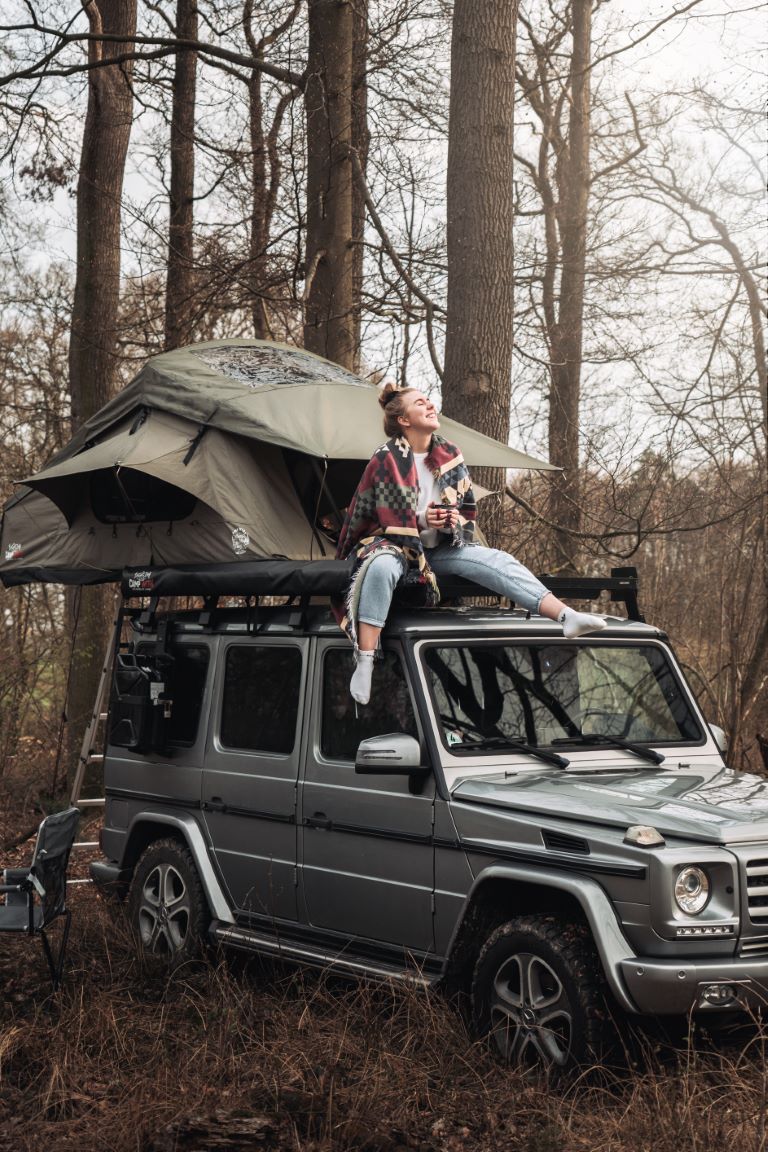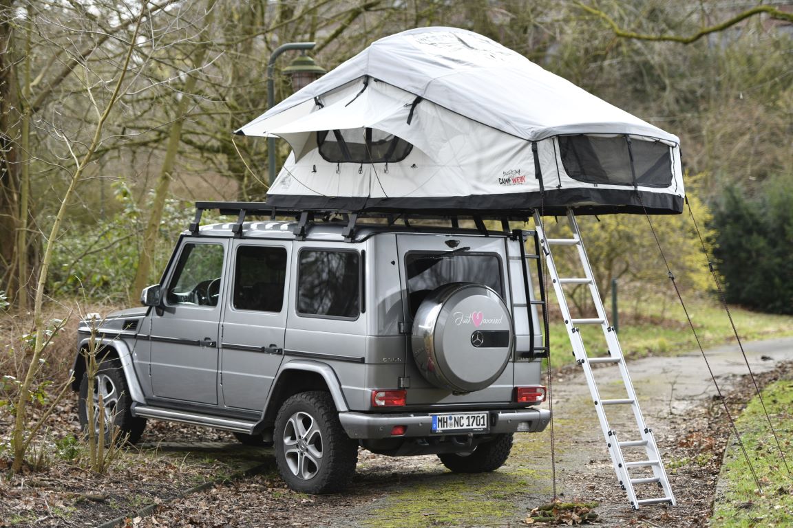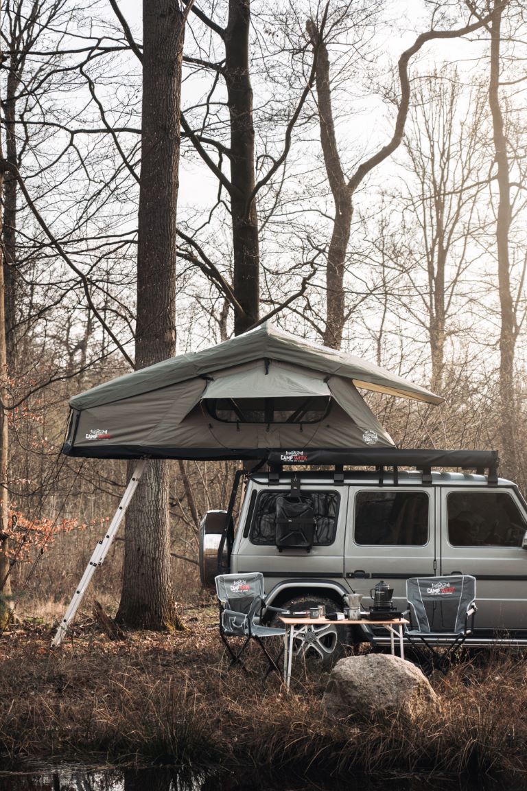 kan nemt nås via den medfølgende stige, så du ubesværet kan komme ind i dit tagtelt. På trods af sin imponerende størrelse og den komfort, det tilbyder, foldes Adventure tagteltet sammen til en kompakt pakke under kørslen, som næsten ikke er mærkbar på taget af dit køretøj. Uanset om du kører ud i det grønne, til havet eller op i bjergene – tagteltet forbliver diskret og påvirker ikke din køreoplevelse.