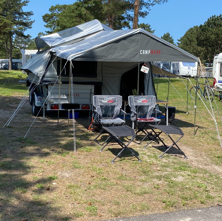 Et telt er i dag åbenbart noget særligt og tiltrækker sig mange blikke på pladsen. Mange har været interesserede i det, også selvom de allerede har en campingvogn. Mange er overraskede over pladsen/rumvolumenet i opslået tilstand, og hvor lille og let det er nedpakket, og at der endda kan medbringes cykler, som er placeret på træktøjet og derfor ikke er i vejen og befinder sig inden for vogntoget. Vi ser frem til mange flere dejlige år med vores teltanhænger fra Campwerk.